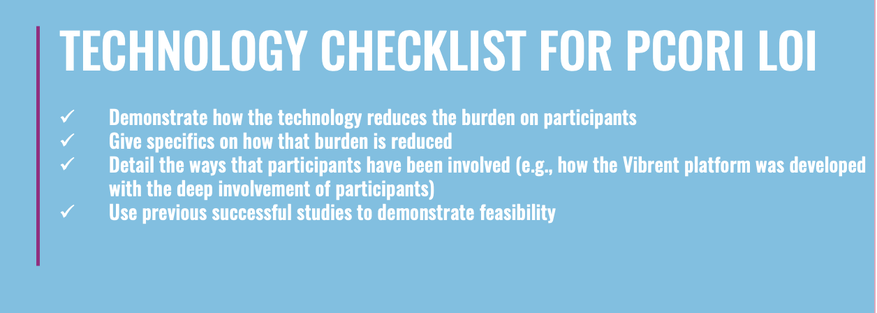 Describing the patient-centric technology is one of the parts of your LOI that can demonstrate how you will measure success, and that can demonstrate validated methods.